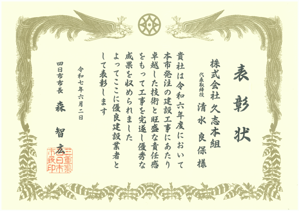 四日市市より令和7年度四日市市優良建設業者として表彰を受けました。