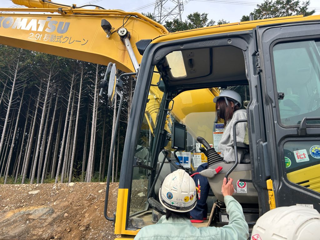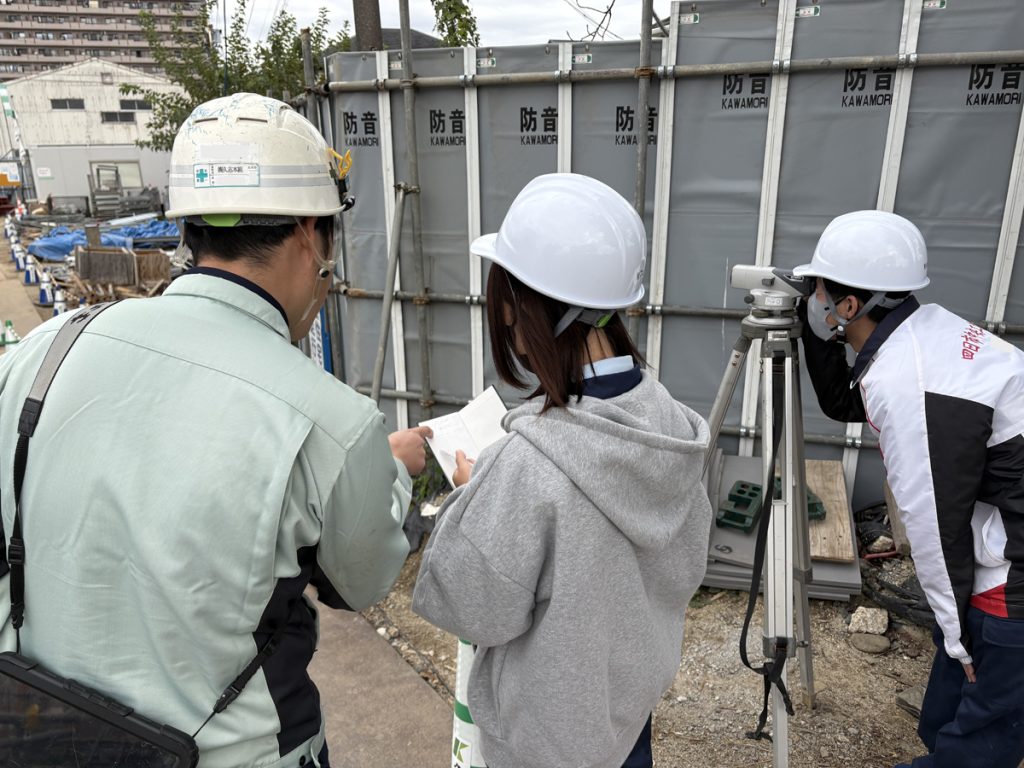 工事概要・進捗状況の説明後、当社の職員に同行して実際に現場に入り、進捗状況を確認するとともに、安全管理や指示出しについて学んでいただきました。また測量や出来形計測、重機体験、ドローン実習・ICT施工などの体験をしていただき、施工中の建築の現場も見学に行きました。
