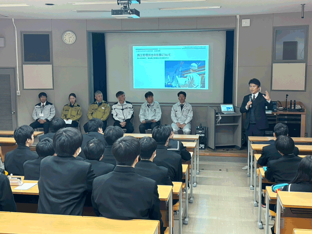 令和8年2月、四日市工業高校にて、三重県建設業協会四日市支部主催の出前授業を開催しました。建築科の2年生を対象に当社社長も講師として登壇させていただきました。